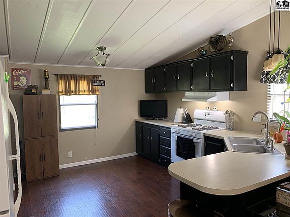 ADORABLE home located on a rented lot in Mustang Park in McPherson. The home is located right off the lake with a large fenced in backyard and view of the playground and lake. Located on a col-de-sac, this home features updated bathrooms, fresh paint, amazing views, and a deck for entertaining. 3 Bedrooms, 2 bathrooms, and open concept living make this home perfect for any buyer. Check out all the amenities surrounding this adorable home. Buyer will need to check with Management of Mustang Park for lot details and Buyer's qualifications.