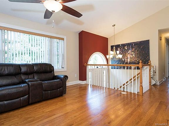 Beautiful, well maintained Raised Ranch awaits you Shining hardwood floors throughout the main level. Spacious living room with vaulted ceiling opens to a spacious dining area and kitchen featuring stainless steel appliances, granite counters and a breakfast bar with stools. Step through back door from kitchen to enjoy your elevated deck with large attached umbrella for all day shade. This level includes a Master Bedroom with attached bath, plus 2 additional bedrooms and another full bath. The lower level offers a family room, bedroom with pocket doors and an oversized closet plus attached full bath and sliders leading to a lovely patio with firepit Lower level floors are ceramic tile and have optional heat to warm your toes in winter. This home is conveniently located near Route 6 close to shopping and many nearby amenities. "Blink" security system included. Book your showing today and be among the first to view this spectacular home