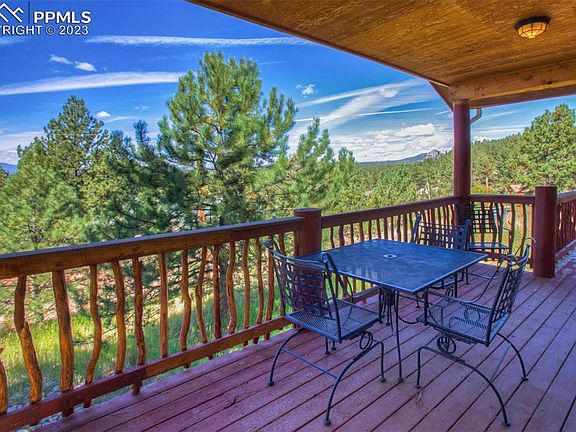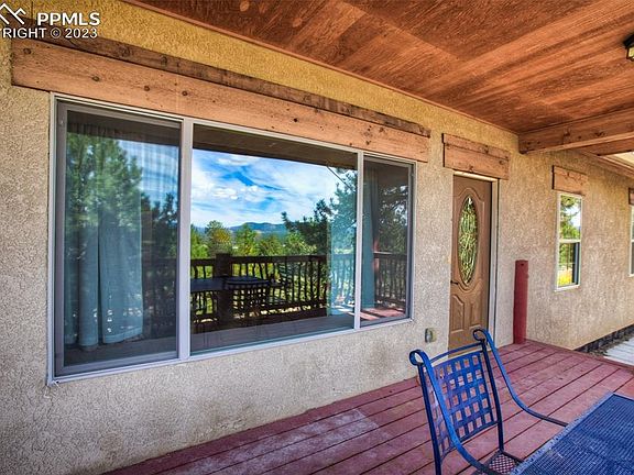 Conveniently located mountain home with great views to the west including Crystal Peak. Admire the scenic sunsets from the large covered front porch that wraps around to the master suite exterior door. The spacious 1.48 acre lot has a nice mix of healthy conifers and level grassy space that would make a nice yard for your pets. 16" concrete/straw bale walls for maximum insulation and efficiency. Low-maintenance stucco siding and metal roof. Inside you will find spacious, convenient one-level living with all the rooms adjoining the central great room with cherry wood flooring and a 2-sided fireplace shared with the master suite. In the master suite are a large walk-in closet, a custom-tiled shower and a walk-out door to the deck and side yard. The spacious kitchen features plenty of counter and cabinet space plus a 4'X6' walk-in pantry; existing appliances are included. 2-car oversized garage with exterior walk-through door. 10'X12' storage shed with pet door. All this overlooking the historic town of Florissant with it's own cell tower for excellent service and available high-speed internet. This area is known for it's natural beauty and abundant public lands; you're just a short distance from Florissant Fossil Beds National Monument, Pike National Forest and world-class fishing in the pristine waters of the South Platte River, 11-Mile and Spinney Mtn Reservoirs. The gorgeous Arkansas River valley is only an hour away, and it's only 90 minutes to prime Summit County skiing. This could be the perfect base camp for all your adventures, call for your showing today!