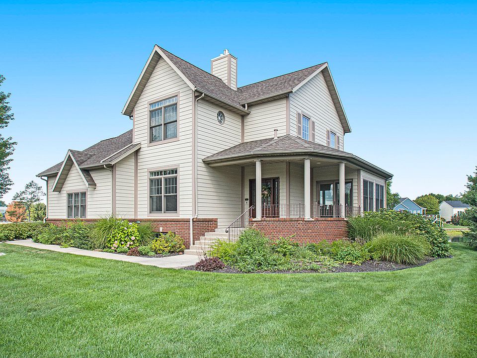 Stylish and well-built Edgewater Dunes home on a peaceful pond lot, just steps from Lake Michigan at Jean Klock Park or Tiscornia Beach. The exterior mixes timeless brick with cement board siding and solid 2x6 framing. Two wraparound porches with wrought iron details bring serious curb appeal and plenty of space to relax outdoors. Inside, 9' ceilings and an open layout make the main level bright and inviting. The Great Room features hardwood floors, three sets of French doors, and pond views, flowing right into a kitchen with stainless appliances and a modern Hood vent. A flex dining or family room adds a cozy fireplace. Upstairs, the primary suite also has a fireplace for extra warmth. Updated Primary Bathroom and hall bath. The finished walkout lower level includes a large rec room, half bath, and bedroom/office with French doors opening to a flagstone patio. Minutes to Harbor Shores, the Yacht Club, and downtown St. Joe—this is where lake living meets everyday comfort.
