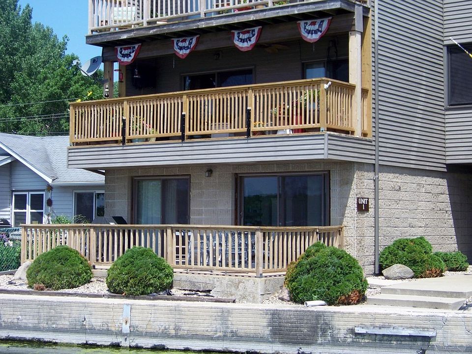 Great ground floor waterfront condo with boat slips and large deck on lakeside. Also includes 4x8 storage unit and attached garage. HOA dues include Water, sewer,garbage, dock in/out, common area maintenance and Master Insurance Policy. This quiet area and low maintenance property is ideal for a seasonal get-a-way or year around use. Short venture to restaurant and McIntosh State Park.