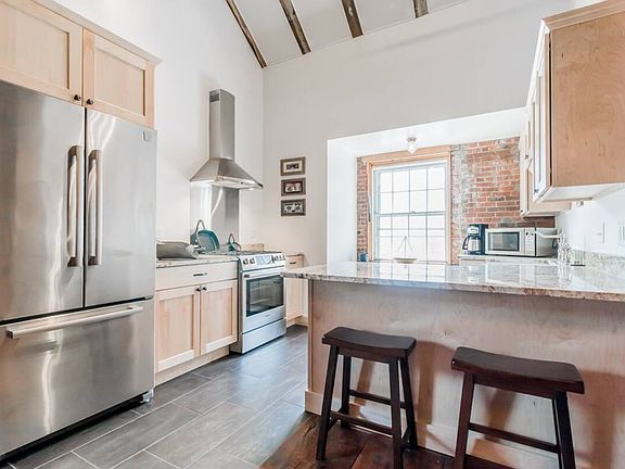 This fully furnished 1 BR/1 BA open loft style condo is located in the heart of the Old Port - perched above the entertainment district of Portland! It offers great views of the working harbor and cobblestone roads of the Old Port. A full kitchen, bathroom and laundry complete this beautiful loft! Heat, hot water, electricity, cable and internet included. With a king size bed, window a/c units (seasonal), free trash removal, full kitchen with dishwasher and garbage disposal, laundry in unit and a comfortable living room with sofa and 2 arm chairs, this space feels like home. (We know; we used to live here!) Access to the condo is by way of exterior stairs, which run along the outside of the building. Wear your flats and carry your heels! Keeping with the charm of the brick building, the stairs were designed to resemble a fire escape. While they they may take a little getting used to, we assure you the stairs are sturdy and were custom made. After a couple times up and down, most people don't give them a second thought. Please note the following: - Parking is not included. There are several parking garages and lots within 1-2 blocks that offer monthly rentals. - Mail cannot be delivered to the property. Tenants must acquire a PO Box at USPS (0.3 mi away). One year lease. All utilities included. No smoking in the property.