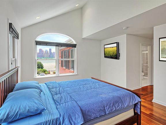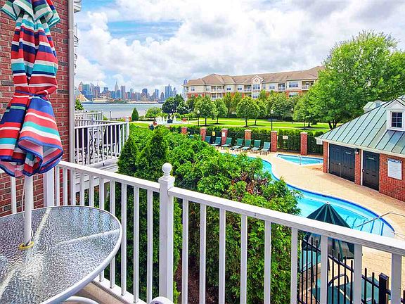 Exceptional Jacobs Ferry Essex town home style condo on the sought after southernmost row of community overlooking park with fountain and Tranquility Pool with fabulous, direct NYC views!!! 2300 square feet of luxury; one of the largest style homes in the community. All four levels are yours; no one above or below you. Two balconies and a patio. Hardwood floors. Canac cabinetry, granite counters, stainless steel appliances and upgraded ceramic tile in gourmet kitchen!! Crown molding, upgraded lighting and custom painted. Jacuzzi tub in master bathroom. Closet organization system in master bedroom. Louvered doors to family room and patio on bottom floor. Parking for two cars; one in private garage and one in driveway. Community boasts two pools with jacuzzis, tot lot, waterfront promenade and free shuttle to NY Waterways Ferry and Light Rail. Close to restaurants and shopping. Steps to 158 bus to NYC. Do not miss this opportunity!