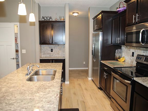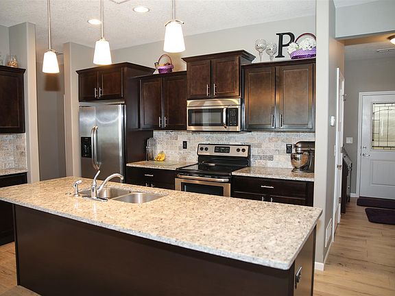 This four year old home is better than new with custom window coverings, established lawn & fencing. One level living, no stairs to navigate. Open floor plan w/4 BR's, 9' ceilings thru out, and vaulted ceiling in living room and tray ceiling in master BR. Large kitchen island with breakfast bar, pantry, coffee or wine station, granite counter tops, tile back splash, custom built cabinets, & wood grain laminate floors for easy cleanup. Laundry room between garage and kitchen has storage cabinet for cleaning supplies, etc. You'll enjoy the spacious master bedroom and bath en suite with large walk in closet, double vanity, tile flooring and accent window for natural light. Covered patio with vinyl privacy fencing. Corner lot that is larger than what is fenced in. HOA maintains lake.