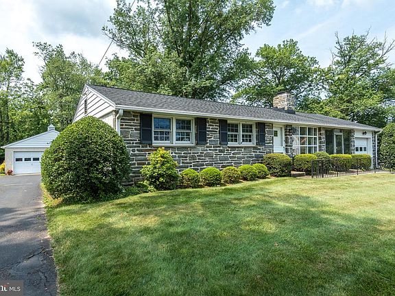 Well maintained, clean and ready to go! This 3 bedroom rancher has character with today's modern features. The first floor features a bright and open living room/dining room concept. The living room has a wood burning stone fireplace and a built in bookcase. Off to the right is an enclosed breezeway leading to the 1 car garage. Off the dining room is a large breakfast room with exposed beams and a window seat overlooking a charming stone patio. The kitchen has been updated with ceramic tile floors, granite counters, smooth top electric cooktop, newer KitchenAid built in double ovens, newer Bosch dishwasher, and glass tile backsplash. There is a side door off the kitchen leading to a second driveway and detached 2 car garage. To complete the first floor there are 3 bedrooms and 1 full bath. There are 2 entrances into the finished basement. The finished basement is a large open room which could be an additional family room, game room, office, playroom or exercise room. For storage there is a cedar closet and a walk in closet in the far corner. The laundry connections are also located on the lower level next to a full bathroom and a bar with a sink. The rear yard won't disappoint with beautiful flower beds (one used to be a pond that went under the side door) and an original Philadelphia Electric Gas light, now electric, for a great conversation piece. The roof has also been recently replaced.