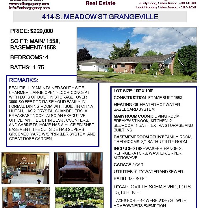 Well-maintained, large home located in the heart of Grangeville with all of town's amenities nearby. With over 3000 square feet to raise your family in. Many built-in cabinetry work, with formal hutches in dining room. Main floor laundry with pantry. 2 crystal chandeliers, kitchen with breakfast nook, executive office with built-in desk, counters and cabinets. Back yard set up with covered porch and garden area. Fully finished basement with many options! Well-groomed outdoors with built-in sprinkler system.