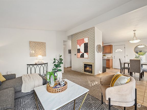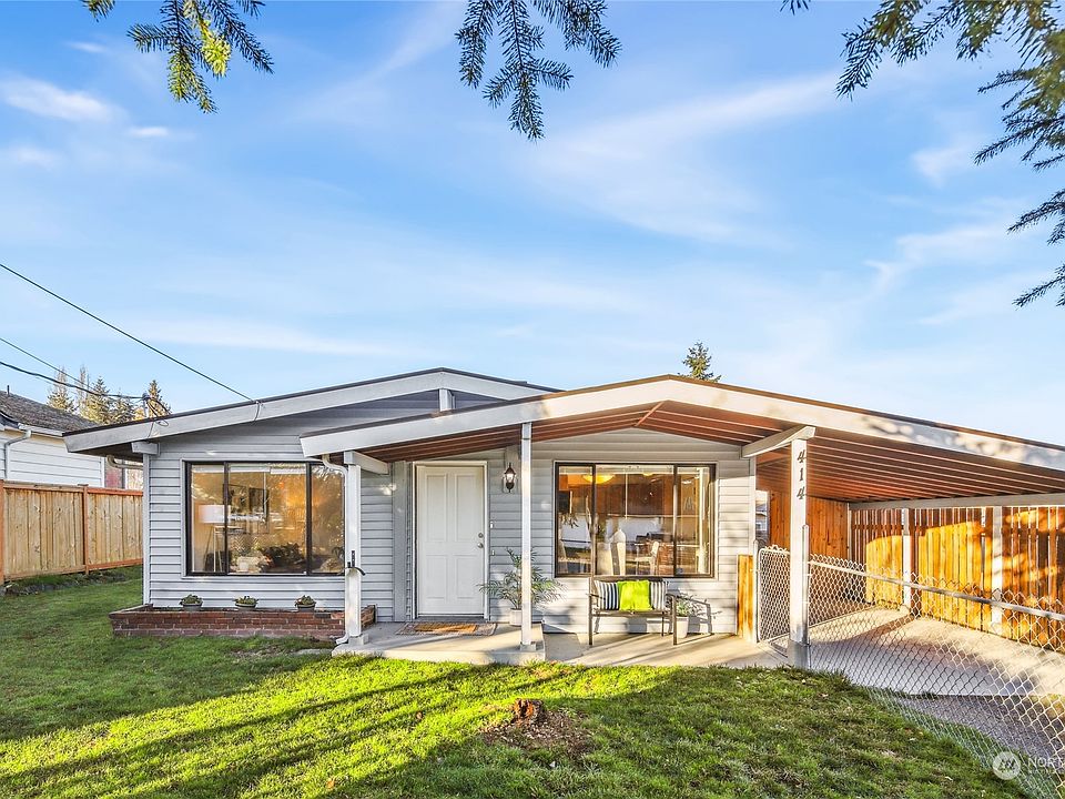 Mid-century magic awaits at this thoughtfully preserved 1954 rambler in a great North Burien neighborhood. Featuring 3 bedrooms and 1 bathroom across 1,030 SF, this home artfully blends period details with modern updates. The light-filled living room showcases vaulted ceilings and a striking brick fireplace. An updated kitchen boasts quality cabinetry and stainless appliances. Generous bedrooms, including a primary with a double closet, complement the refreshed 5 piece bathroom. Newer Whirlpool washer and dryer. Outside, the 6,600 SF lot unfolds into a fenced level yard perfect for play, complete with a patio for entertaining, mature landscaping, storage sheds, and a carport. Minutes to parks, beaches, freeways, shopping, and SeaTac.