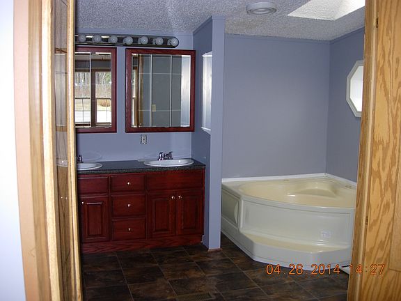 This home has a detached garage with a huge deck and covered walkway between the house and garage. The garage has room for two cars and also has a workshop (or storage area -16 5" by 18'2"). Walk into the kitchen and you will see that there are plenty of cabinets in this home as well as an island. A pass-through to the living room gives the home an open feel. There is a separate dining room that is open to the kitchen. The living room has a beautiful stone fireplace. The fireplace insert and the brick was replaced in 2016 and it was all inspected, including the chimney. The master bedroom is located at one end of the home and is very spacious. It has a full bath with double vanity and a jetted garden tub and a separate shower stall. The walk-in closet is 7' x 6'. At the other end of the home are two more bedrooms and another full bath. The bedrooms each have closets in the corner that measure 3'9" x 3'10". The bathroom has a shower/tub combination as well as a linen closet.