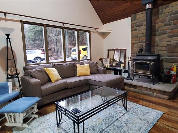 Perfect place to call home or a weekend retreat... nestled in nature is this 3 bedroom home on almost 11 acres. Featuring spectacular views into the woods, overlooking the pond and creek. The stunning cathedral ceilings capture as you walk in the door, take in the beauty on 20 foot Tongue & Groove hand crafted by the Amish. 1st floor master bedroom and open loft hosting the second bedroom with 8 built in beds. This home offers a updated kitchen with farm sink and stainless steel appliances and from the dining area you can exit to the large cover patio. Ideal place to entertaining. Hold all your equipment in the 14X10 shed and 17X7 storage area. Whether this is your permanent residence or causal relaxing retreat... You will find this home your own little piece of paradise.