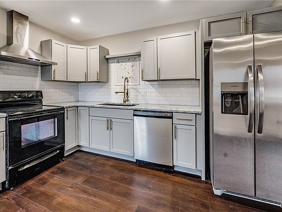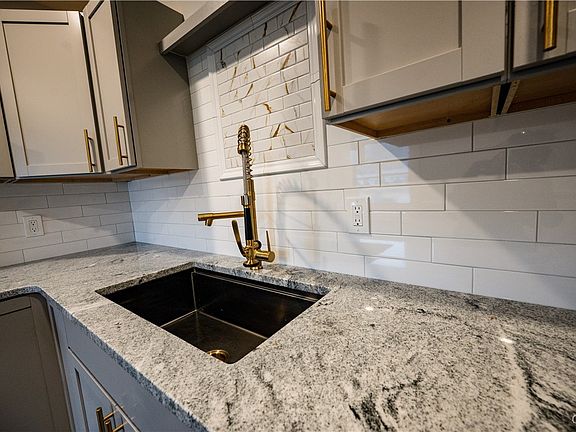 The sleek kitchen features updated cabinets, a stunning granite countertop, and brand-new appliances.