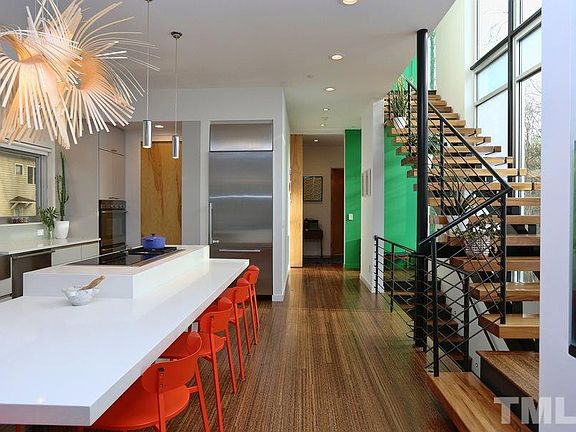 Modernist award-winning masterpiece designed by architect Phil Szostak, sits right downtown amidst all that Chapel Hill has to offer! Green features & hand-selected materials throughout. Trees & garden create quiet & privacy. European-style kitchen boasts high-end appliances, Caesarstone, German-made cabinets & convenient dumbwaiter. Master bath w/ teak wall & deep soaking tub. Enjoy outdoor fireplaces on 2 terraces while you sip wine & watch the sunset over downtown. Endless features & style.