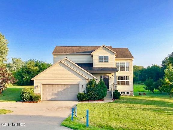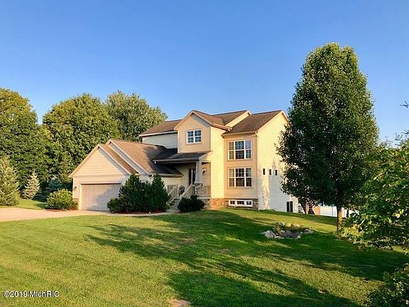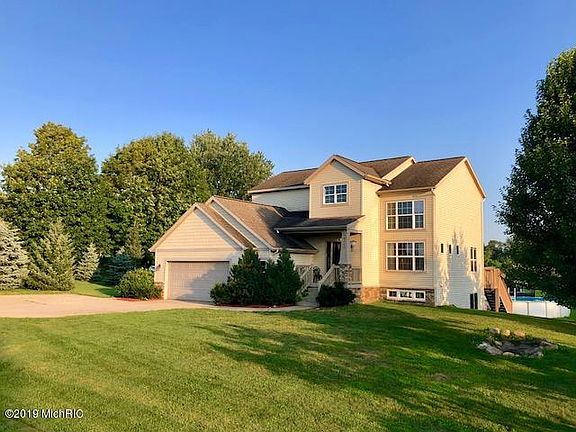 2006 custom 2-story 5 bedroom walk-out home, with almost 3000 sq ft, in the Award Winning Byron Center Public Schools, on 1.1 acres with no neighbors behind, is ready for a new owner to enjoy! The main floor, with new flooring in the last year, boasts a 22 foot ceiling in the living room. The kitchen has custom cherry cupboards and granite countertop, and eating area. There is also main floor laundry, a half bath, and a master bedroom with a full bath and walk-in closet. The upper level has 3 bedrooms, a loft area and a full bath. The lower level has a large rec area, full bath, 5th bedroom and storage. The exterior has a pool and a hot tub that both stay, storage shed, garden area, and no neighbors behind. Call for you private showing today!