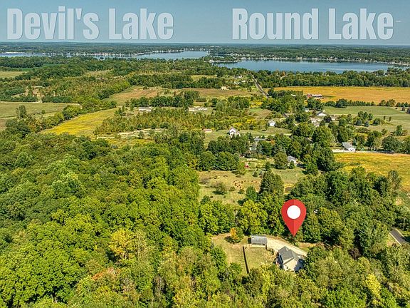 Escape to 3.25 acres of wooded serenity just minutes from Round & Devils Lakes. This Cape Cod welcomes you with an airy kitchen and vaulted great room designed for gatherings. Upstairs, the spacious loft serves as a true primary suite with full bath and generous closets, offering privacy and retreat. The finished walkout basement is perfect for entertaining with a bar and recreation area. Outside, trails wind through the trees, while a 30x30 pole barn and extra outbuildings provide space for hobbies, projects, or animals. Nearby golf, wineries, and MIS Speedway make every weekend an adventure.