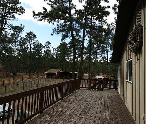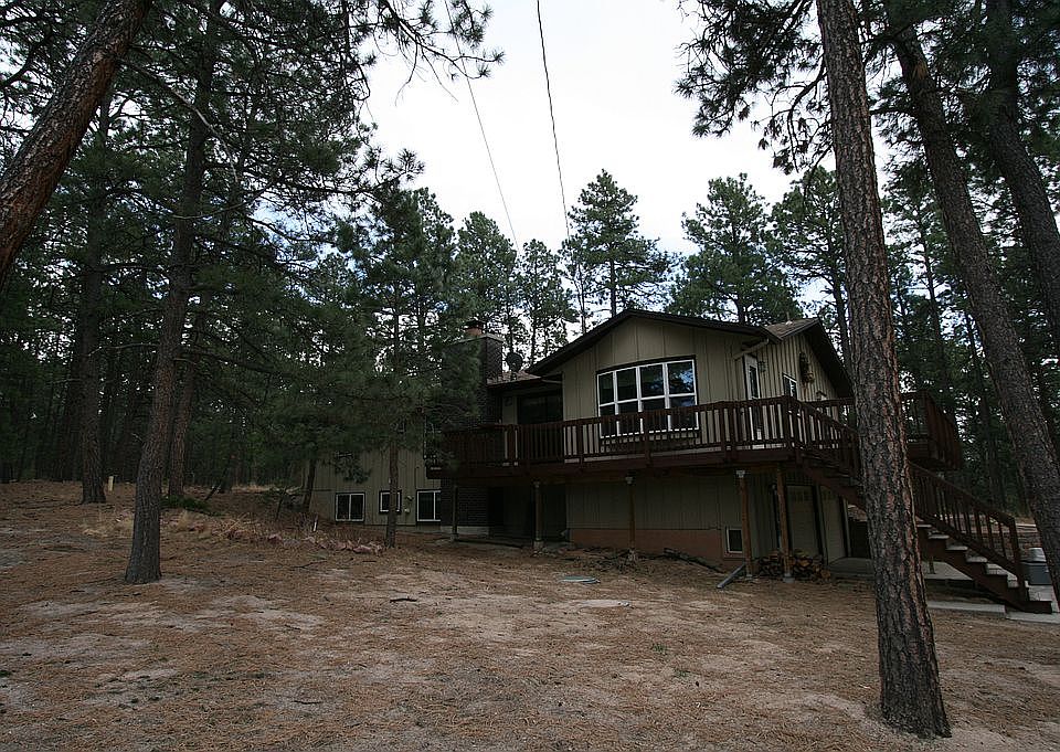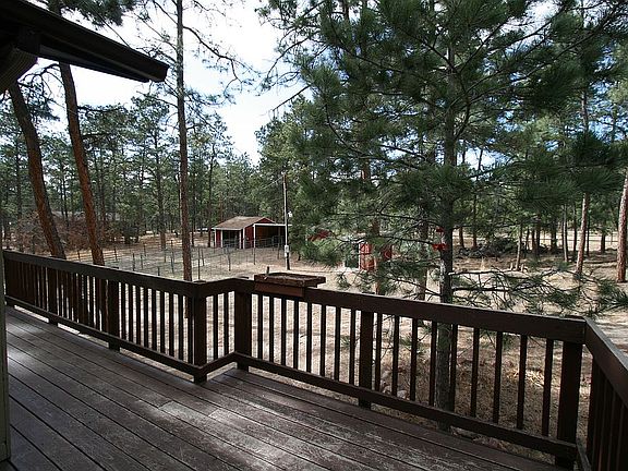 Come enjoy quintessential Colorado living in this beautiful haven in Black Forest, the perfect combination of quiet rural life and easy access to the city. Nestled on 4.77 acres of rare horse property and ponderosa pine trees, this raised rancher has a newly painted exterior and large weather-resistant decks that wrap around much of the home. Soak in the beauty of your surroundings in the relaxing hot tub with gazebo cover. Explore the property that includes an enclosed 24'x16' workshop with exhaust fan and 30-watt outlet for RV hookup (workshop could be converted back to a barn), a 2-space carport (previously a loafing shed) in addition to the attached 2-car garage, another storage shed, and a large horse corral. Inside the home is more Colorado country living. The main level has been recently updated with brand new wood laminate flooring. The dining room is bright and open with a large window overlooking the deck. The living room is spacious yet cozy with a wood-burning fireplace/stove and stone surround. The large kitchen features stainless steel appliances, granite tile countertops, bar seating, a pantry, and a cozy breakfast nook with a bay window and window seat. The oversized attached laundry room has extra space to incorporate a mudroom or additional cabinets and countertops. The main-level primary suite boasts a unique wood feature ceiling, an en-suite bathroom, and a walk-in closet. A 2nd bathroom and the 2nd bedroom with an attached hand-built Murphy bed complete the main level. The finished basement includes another rustic wood feature wall, a built-in drop zone for coats and backpacks, two more bedrooms, a 3rd bathroom, and the family room. A storage room houses cisterns for extra water storage, water filtration and radon mitigation systems, and a reverse osmosis system. Reroofed in 2019 with Class IV hail-resistant shingles and a new well pump installed in 2020, theres not much left that needs to be done for you to make this your next home.