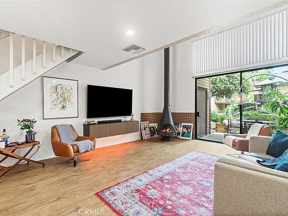 The light-filled living area features vaulted ceilings, a cozy fireplace, and access to a large private patio with tranquil stream views, a storage closet, and in-unit washer/dryer access. Recent upgrades include new flooring, modern kitchen cabinetry, fresh paint, smart switches, and updated lighting throughout.