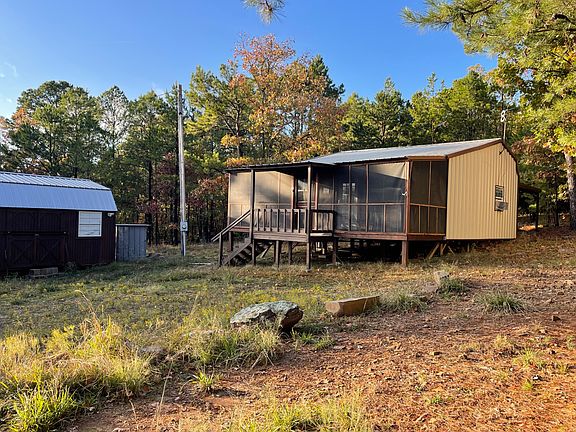 AirBNB opportunity! Two Cabins on 5 acres with electricity, heat, air conditioning, a 1000 gallon septic and a Well for water. Located on Little Flat Top Road in the Kiamichi Wilderness that has approximately 10,000 acres of land around Big Mountain. Your Oasis is here. The wilderness offers tranquil creeks, mountain terrain, tall trees, and beautiful scenery, with plenty of wildlife. Enjoy hiking, fishing, and just getting out and enjoying nature! The Kiamichi has yearly dues of $200 and also $35 yearly for the on site volunteer fire department and helicopter pads. This 5 acre property has two cabins on it. The larger cabin is 575 sq/ft with a bedroom, loft, Kitchen, bathroom, laundry, and living room. The front porch is screened in and there is a covered area off the back. The smaller cabin is 240 sq/ft with an open kitchen living area, a bathroom, and closet. This cabin also has a covered deck out front. Both of the cabins have electricity, water, heat, air and a septic system. A 12x20 shed is also in place for storing your recreational vehicle that also has electric and its own breaker box. This place is ready for all of your future memories.