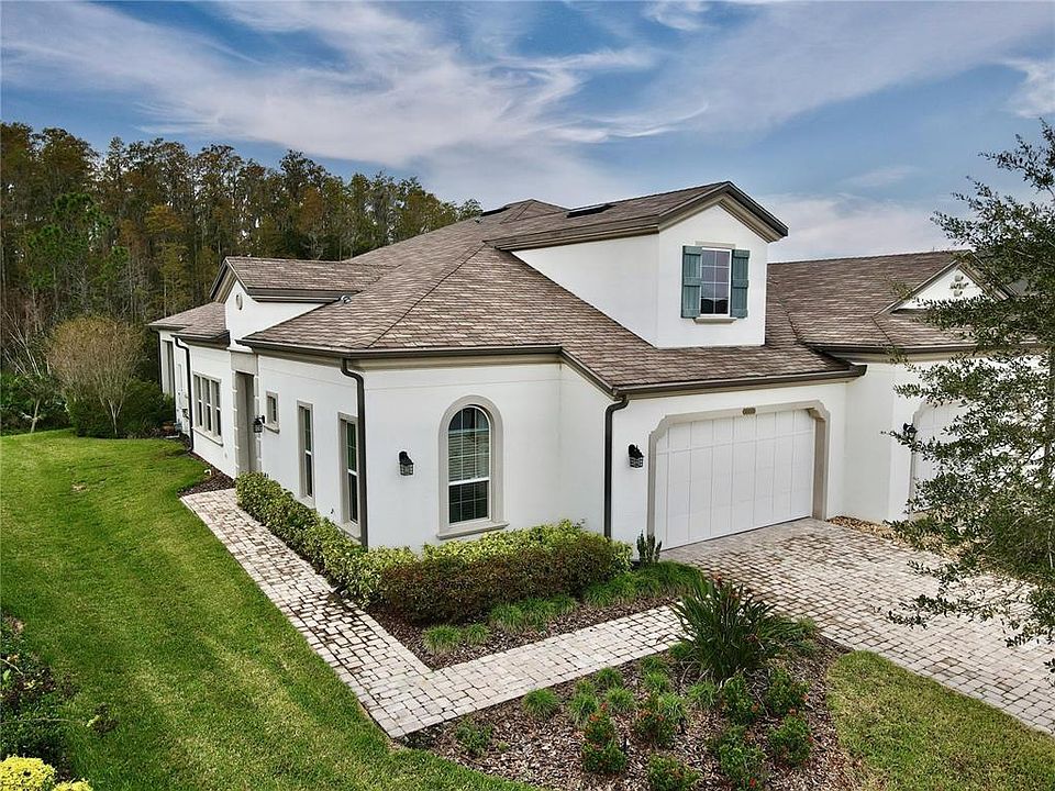 Resort-style, maintenance-free living in the sought-after Santeri Villas at Estancia! When you enter this gorgeous villa, you won't want to leave. The home features abundant sunlight, an open floor plan, and soaring 10-foot ceilings. Custom glass in the 8-foot front door draws in natural light, but also affords maximum privacy. The living room opens onto the back porch through 8-foot sliding glass doors with transom windows, giving maximum natural light plus a lovely view of the backyard and wooded conservation area behind the house. The master bedroom shares this view and features motorized Hunter-Douglas shades, spacious walk-in closet, and en suite bathroom. In the gourmet kitchen, you'll find quartz countertops, a ceramic backsplash, a large center island with breakfast bar, Whirlpool's Gold Series stainless steel appliances, double ovens, 5-burner gas cooktop, and a walk-in pantry. Glass French doors open into the office/den, perfect for working from home. Other features include custom window treatments, three ceiling fans, spacious laundry room with sink, and a new Samsung washer/dryer. The roomy two-car garage has a 240V outlet for EV charging. Amenities at Estancia include a large swimming pool and waterslide, fitness center, clubhouse, playgrounds, walking trails, and tennis courts, plus nearby parks. Santeri Villas is a gated community within Estancia offering a second swimming pool, a hot tub, and a dog park for Santeri residents only. You'll be minutes from the Shops at Wiregrass and a quick ride to Tampa, near I-75, I-275, hospitals, Tampa Premium Outlets, The Grove, and great restaurants. This villa is your chance to live like you're on vacation every day. Don't let it get away!! https://smartreal.com/interactive-3d-home-tour/9b402611-0f50-418e-bd44-61535cc3a665