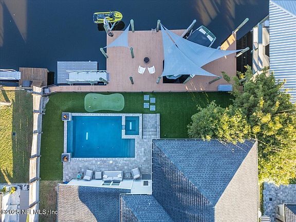 Nestled on a sun-kissed stretch of Jacksonville's premier waterways, This 3,882sqft, 5 bed/3.5 bath home with an inground pool and spa is the embodiment of coastal luxury living with a blissful blend of serenity and resort-style entertaining. The home sits directly on the intracoastal waterway with 24/7 deep water navigable access. A premium oversized dock anchors the property with a 10,000lb boat lift providing secure mooring for your watercraft and convenient access to the open water. Outdoor Living at its Finest. The resort-style pool makes a bold statement with beautiful fire features, a sun-splashed pool deck, and ample lounging zones. A luxurious hot tub accents the pool area. The expansive pool deck flows seamlessly into a shaded alfresco dining area and a covered veranda, ideal for entertaining friends and family against a backdrop of water and sky. The second story has its own covered balcony, perfect for sitting and relaxing behind the shaded bamboo trees. Interior: Contd. Interior: Open Living Spaces: Sun-drenched rooms with oversized windows and glass doors invite the outside in, creating a luminous, airy feel. Thoughtful architectural detailingcathedral ceilings, and designer finishesstreamlines a sophisticated, yet comfortable aesthetic. Chef's Kitchen: A centerpiece kitchen features high-end appliances, stone countertops, a substantial island for casual dining, and a layout that makes entertaining effortless and enjoyable.