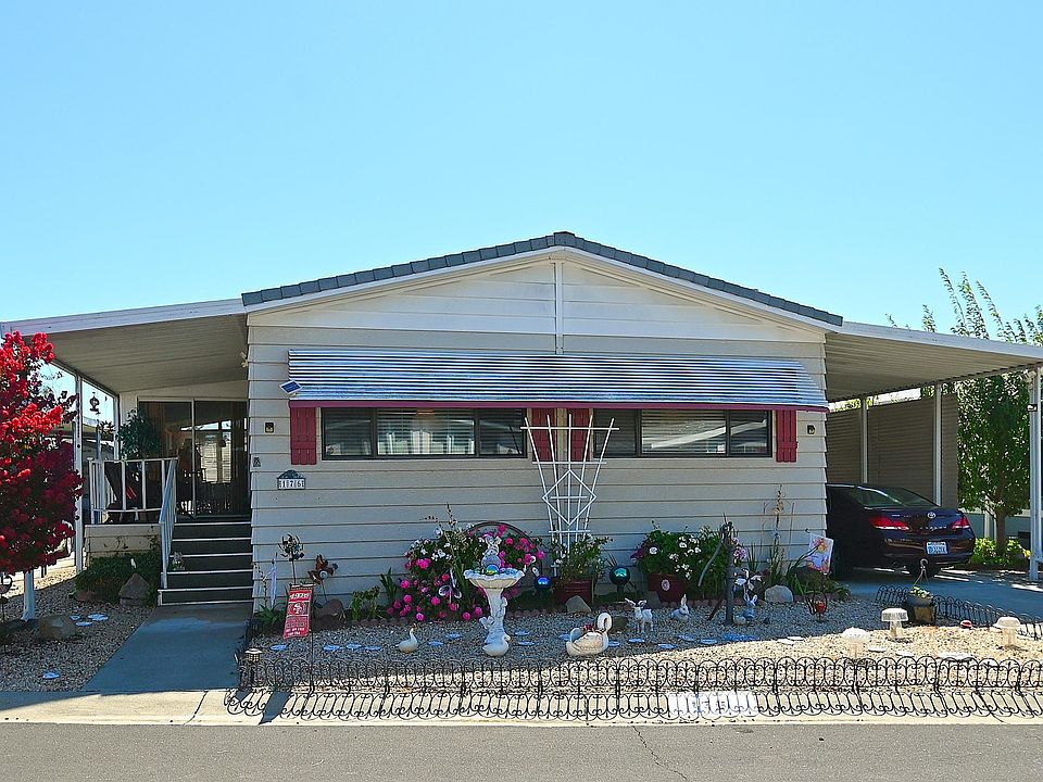 This beautifully maintained 3-bedroom, 2-bath mobile home has so much to offer! It features some water-resistant vinyl plank flooring (VPF), dual-pane windows, and a newer central heat and A/C system. The spacious primary bedroom includes ample closet space and an ensuite bathroom with double sinks, and a soaking tub. One guest bedroom offers built-in cabinets, providing great storage and counter space. The large laundry room is equipped with both gas and electric hookups, a built-in desk, plenty of storage cabinets, a sink, and a freezer. An enclosed cabana room offers additional living space that’s not included in the square footage. Outside, enjoy the beautifully fenced backyard with fruit trees, along with covered front and back porches. The home also features a covered two-car parking area located next to guest parking, and a large storage shed for extra convenience. Located in the desirable BESARO Active Adult Community, where one resident must be 55 or older, and all others no younger than 45. Park approval is required, and homes must be owner-occupied. Make this beautiful home yours today!