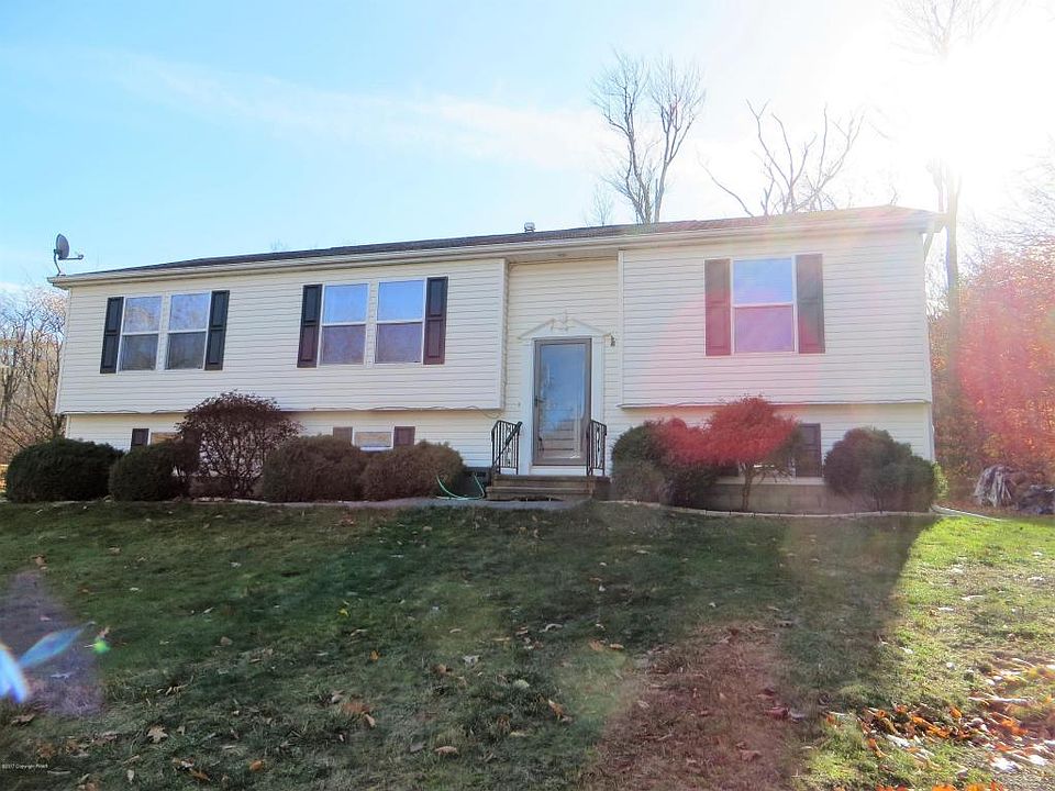 POCONO FARMS BEAUTY! Lovely bi-level 4 bed/2 bath home. Plenty of space for the whole family. You'll love the feel of this spacious and tastefully decorated home with it's roomy layout and cozy woodstove at the heart of the home. Pretty kitchen with unusual tile backsplash and stainless appliances. Dining/living combo area with hardwood floors and vaulted ceiling. Beautiful master suite with own bath complete with soaking tub under skylight. Lovely tiled main bath and 2 good-sized bedrooms complete the main level. Downstairs there is tons of space, including 4th bedroom. Also not one but TWO family rooms, one currently being used as bedroom/sitting room for relative. DON'T MISS OUT ON THIS ONE! TAXES UNDER $5000! Check out the photo tour and make appointment today.