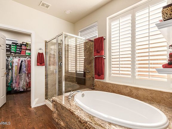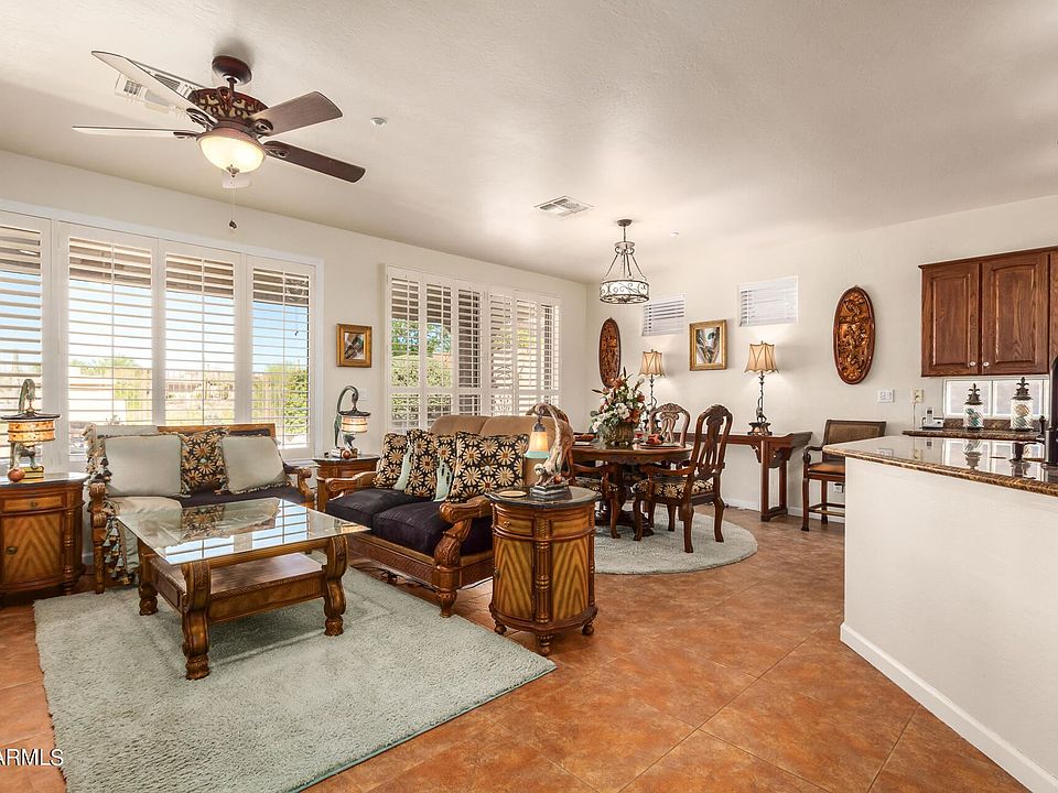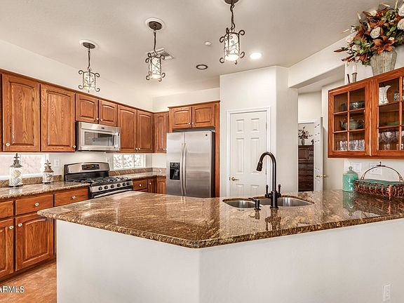 Luxury at a Tremendous Value In Anthem Country Club! OVER $60K IN ELEGANT UPGRADES AND RECENT IMPROVEMENTS, including new roof! The open concept two-bedroom, two-bathroom home features solid granite countertops throughout, raised paneled dark oak cabinetry, plantation shutters and newer stainless-steel appliances. Enjoy the convenience of a 5-burner gas range with TWO ovens! Glass cabinet doors above the kitchen island and glass block over the counter tops add to the bright, airy feel of the kitchen. New matching upgraded lighting added in the entry patio, and throughout the living areas in 2021. Hall bath features a new custom tile shower with a folding teak seat and hand-held showerhead for a spa experience! Floors are tile with wood-grained tile in the bedrooms. Soft water system.