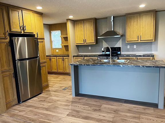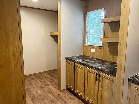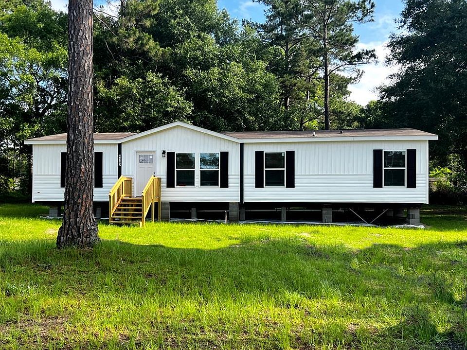 Beautiful NEW 2022 28x56 Clayton Mobile Home. 4 bedroom 2 bath 1568 heated Sqft. on .38 Acres. Large living room with a coffer wall accent, stucco ceilings, and large windows. The walls are beige, grey, and white wooden panels that will go along with a variety of color schemes. The kitchen has an island with USB ports, a deep sink, and a single-hand pull-down sprayer, stainless steel Frigidaire appliances and stainless steel range hood vent, with light birch cabinets. A work area/ office space has shelves and bar separating the kitchen and the laundry room. A large master bedroom with large closets. The master bathroom has a double sink white vanity with a touch of modern yet traditional beauty that has drawers and ample storage underneath on the shelf, a deep garden tub, and a separate toilet area. Nice yard with front and back decks for entertaining and enjoying nature.