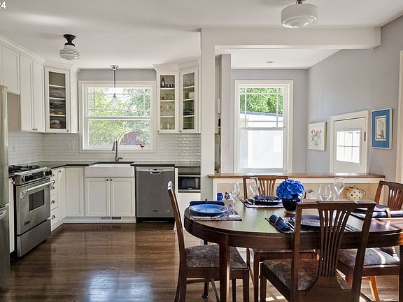 Many lovely features make this Roseway Bungalow Best in Show. Open beam living room, gas fireplace, hardwoods, deluxe wood windows throughout. Updated kitchen and bath. Detached studio has barn doors open to patio. High ceiling basement offers sweat equity for 3rd bedroom. Sunsets on the big front porch and barbecues in the private backyard. Not bad!