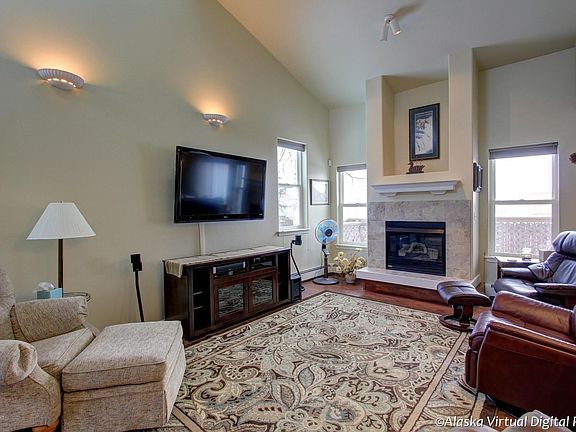 Immaculate end unit with southerly views of Chugach mtns, expanded deck with enclosed railing, all 3 bedms are on second floor, master suite has private bath & WIC, Laundry room on 2nd floor, open concept design - direct vent FP, large kitchen w/breakfast bar and built in pantry storage, extra spacious dbl garage w/laundry sink, Security system, Many special features to enjoy.