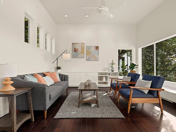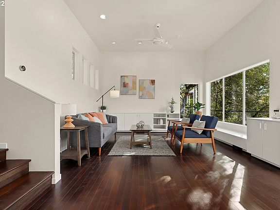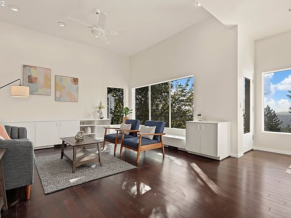 Stunning Contemporary Home in Portland Heights. Glorious Views to South & Cascades! Extensive Hardwood Floors through first and second levels, High Ceilings, South Facing Windows Flooding the Home Year Round w/ Light & Warmth. Open Floor Plan w/ Outdoor Access onto Decks Facing Views. Primary Suite w/ Bedroom, Spacious Bath w/ 2 Person Shower, Private Deck, & Large Walk In Closet. Main level office or non-conforming bedroom. Lower 3rd level could be another bedroom, family room or theatre room! [Home Energy Score = 6. HES Report at https://rpt.greenbuildingregistry.com/hes/OR10202638]