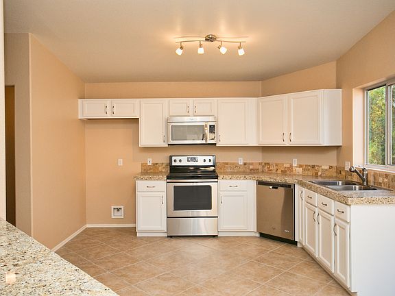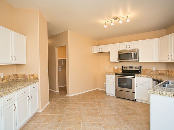 Pathway to Purchase eligible!! This move in ready 3 bed, 2 bath home features large updated kitchen with granite counter tops, white cabinets, stainless steel appliances, pantry, and a breakfast nook. Featuring vaulted ceilings in the great room and dining room combo, ceiling fans in every room, bathrooms with travertine tile and tumbled marble shower surrounds, granite counters and baths with dual sinks in the master bath, this home has it all! Stay cool with the newly replaced AC in 2018. Outside you can enjoy your landscaped large lot with beautiful green turf, pavers, and covered patio. The roof was replaced in 2016.