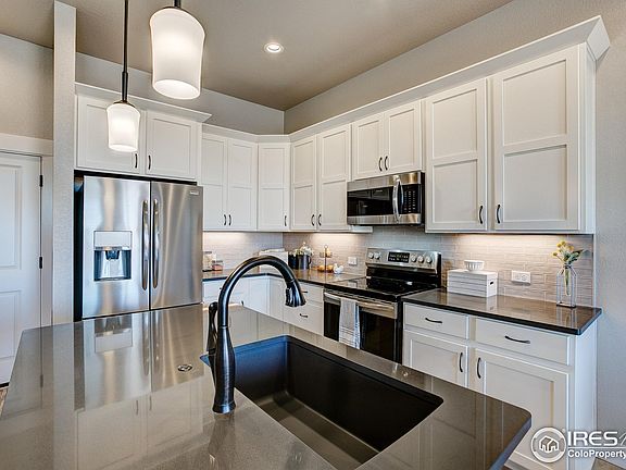 MOVE IN READY! Landmark Homes presents The Shores at the Lakes at Centerra, featuring 4 floor plans, high-end finishes, attached 2 car garages w/ extra driveway parking, full unfinished basements & fenced front porches. Each building consists of 4 plans to fit your lifestyle, including a main floor primary ensuite plan, 2 interior plans w/ all bedrooms upstairs & an end ranch style unit w/ a finished basement. Conveniently located for easy access to I-25 & various shopping, entertainment, dining, medical & other services. HOA includes cable & internet. Landmark Homes' included features w/ each home: engineered wood floors, designer finishes, quartz counters, tile backsplashes & surrounds, under cabinet lighting, bronze/nickel lighting & plumbing fixtures, stainless appliances, solid doors, A/C, ceiling fans, fireplace, high efficiency furnace & tankless water heater. Pool, club house & surface lake access included w/ Master HOA&Metro District. Ask about our community incentives!