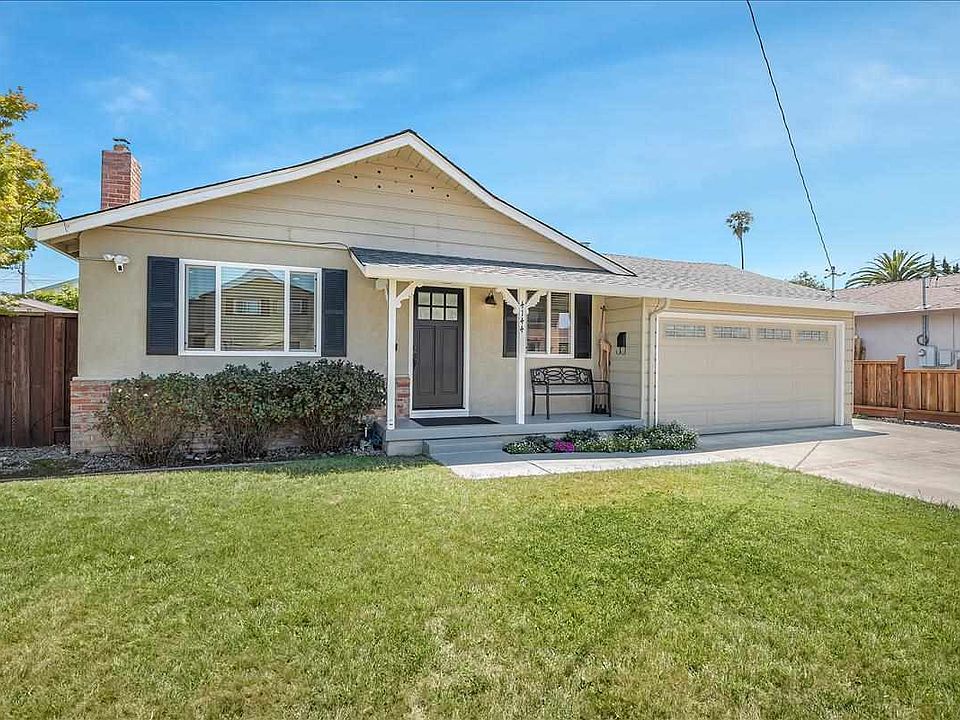 Beautifully maintained 4 bedroom/2 bathroom home on a premium lot! With almost 1,300 SF of living space, the open floor plan makes this home feel much larger! Features include laminate flooring throughout, a stone fireplace in the spacious living room, & a large dining area that is open to the well-appointed galley style kitchen. The kitchen includes white cabinetry, stone back splash & stainless appliances with a flat top stove/oven combo, built-in microwave, dishwasher & double sided sink. Master bedroom has an updated en-suite bath with wainscoting & a stall shower. Secondary bathroom is also updated with tile floors and tub surround. Lovely backyard landscaping with plenty of room to entertain; large stone patio and grassy area for outdoor activities. Garage includes built-in cabinets and epoxy floor. AC. Fabulous location close to shopping & dining plus easy access to freeway. Come view this gem with updates galore!