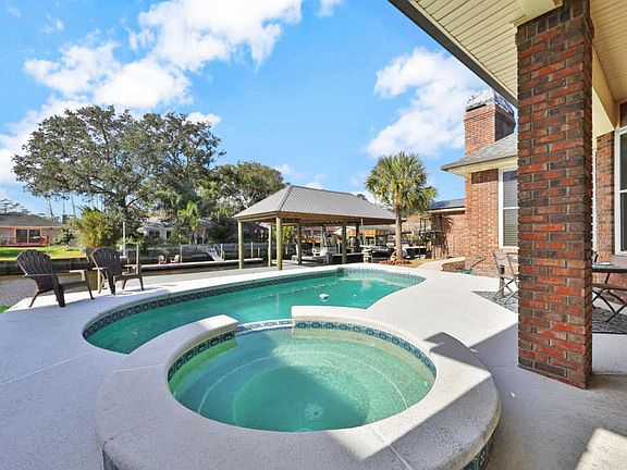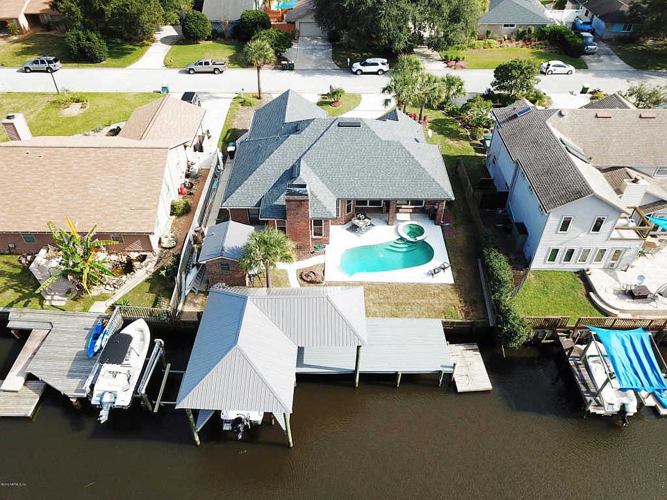 This house is ready for a boater or water enthusiast to move in! Pool, spacious deck, boat slips with new roof, outdoor pool bath, and updated kitchen! Stylish light fixtures and wall unit that gives the feel of a built-in. Recently updated kitchen with Kitchenaid appliances, quartz countertop, and breakfast bar. Master bath countertops and vanities recently updated as well. Common area flooring is 3 layer waterproof (vinyl, cork, & wood). Boat house has a covered 8,000 lb boat lift that fits a 24 ft boat and an uncovered 6,000 lb boat lift that can fit a 21 ft boat. Additional upgrades to the home that were completed in 2016 are flooring, family room accent wall, roof, AC, and windows.