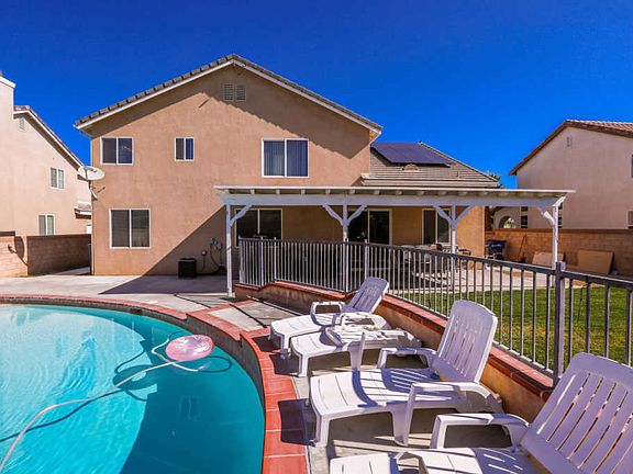 West Lancaster Pool & Spa home with 5 bedrooms & 2.5baths & upgrades galore!!I Solar is paid! When entering this home entertainment is not a question.Front living area is used as game room with pass thru to kitchen for snacks & drinks!Kitchen is upgraded with grey cabinets,recently installed Quartz Countertops,Custom backsplash of tile & specialized metallic design.Wood laminate flooring runs throughout the downstairs.Kitchen is open to family & dinning area with fireplace.Down stairs bathroom & laundry are easy access.Downstairs bedroom is like a second master bedroom.Slidding glass doors lead from kitchen to large outdoor covered patio and grass area.Pool & spa finish this backyard oasis & are gated with rod iron fencing! Going upstairs is grey carpet just 2 years old.Master bedroom has double door entrance oversized space with ceiling fan & blinds.Master closet is a dream space.Master bath has a soaking tub,walk in shower & double vanity.Goin