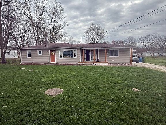 One floor living on almost a half acre. This 3 bedroom 1 1/2 bath has an oversized attached garage which enters into the family room. The kitchen opens to the formal dining room and living room. It features a large center island and stainlesss steel appliances. There is so much pride in ownership on this one. Updates include an additional furnace and air conditioner located in the garage for the bedroom 2022, new well line 2023, fresh paint and new carpet 2022, dishwasher 2024. both sheds stay. The large shed is 10x 20 x11 and was built 10/10/22. The large backyard is completely fenced with a wood privacy fence. The back patio and deck is great for entertaining as well as just having a conversation on the covered front porch. This home will not last, so schedule your showing today.