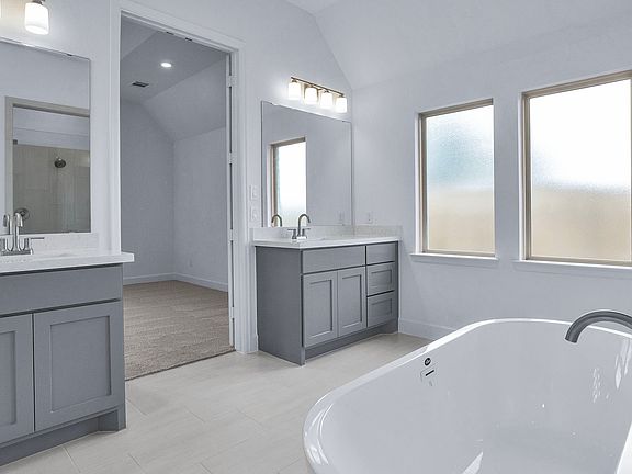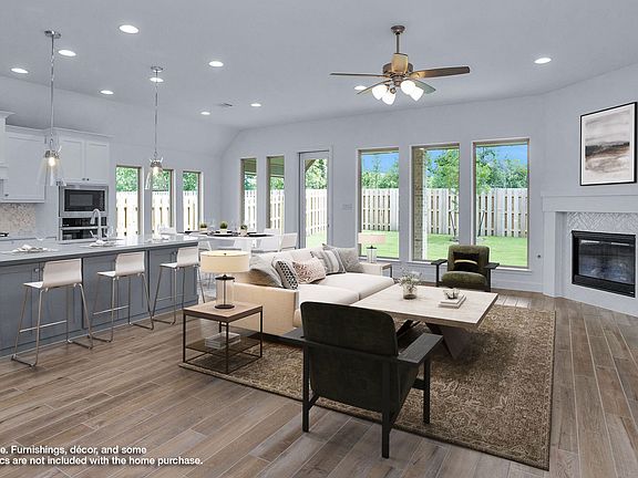 Entry welcomes with 12-foot ceiling. Game room with French doors and 12-foot ceiling off extended entry. Kitchen and dining area open to spacious family room with a wood mantel fireplace and wall of windows. Kitchen hosts inviting island with built-in seating space and 5-burner gas cooktop. Primary suite includes bedroom with 12-foot ceiling. Double doors lead to primary bath with dual vanities, freestanding tub, separate glass-enclosed shower and two walk-in closets. Abundant closet space and natural light throughout. Extended covered backyard patio. Mud room off three-car garage. Representative Images. Features and specifications may vary by community.