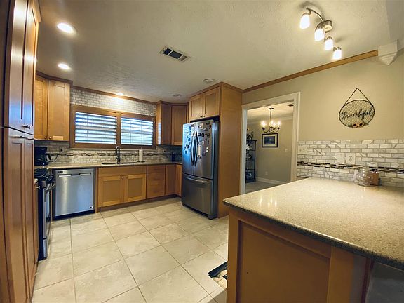 North Vidor on over 3 acres!!! This 3-bedroom home is spacious and has had a very nice remodel. Kitchen features new cabinets, granite counters, stainless steel appliances, Italian marble backsplash, built-in pantry, breakfast bar, breakfast room and formal dining or office area. High ceilings, custom window coverings throughout, wood burning stove, french doors to covered back patio overlooking a beautiful backyard! Hall bath has custom walk-in shower with bench seat, primary bedroom's private bathroom has a soaker tub. Lots of storage and the 1 acre lot next door is included too totaling 3.1 acres, would be a great area for horses or a shop! Lots of possibilities here, make your appt today!