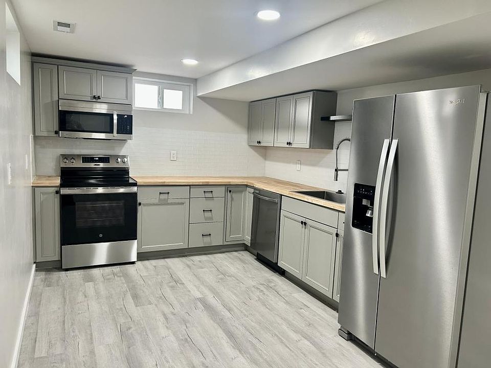 BASEMENT UNIT APARTMENT. Newly remodeled from the studs out. Features separate direct access, 3 bedrooms, 1 bathroom attached 1 car garage. New flooring, paint, tile, kitchen, appliances, bathroom, egress windows higher ceilings. Electric, sewer, water Wifi are included with the rent. Lawn care Snow Removal are also included. Tenant pays for garbage pickup. Back yard is shared with main level unit. Back patio is split with main level unit.No Smoking.