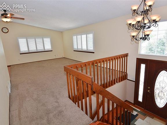 Beautiful Bi-Level home in an Established Neighborhood. Gorgeous Wood Floor & Wood Stair Entry. Large Living room with Carpet & Ceiling fan. Gourmet Kitchen with Center Island Stove top, Double oven, nice tiled floors, Plenty of Cabinets & Counters, Adjoins a Sizeable Sunroom with French doors that lead to a 17x14 Concrete Patio, a Huge Wood Deck & Fenced back yard. Separate Dining room. Spacious Master Bedroom with Black out European Shutters, a 14x6 Walk-in closet & Attached full bath with his/her sinks & Oval Jetted Soaking tub. Laundry room, Full bathroom with Skylight & One Additional Bedroom with 8x6 walk-in closet on the upper level. Huge Family room in Lower Level with a Brick Wood Fireplace, One bedroom with Window Wall Scenes, a Full Bathroom & lots of Storage Space. 2 Car Attached Garage. Large Workshop off the garage! Near shopping & schools. Storage Shed. Nice Mountain Views & View of Pikes Peak! Must See!