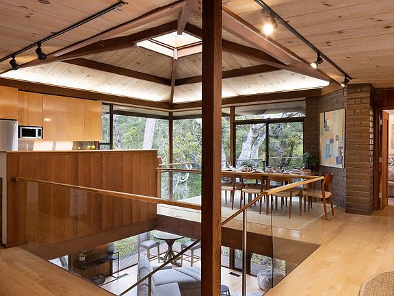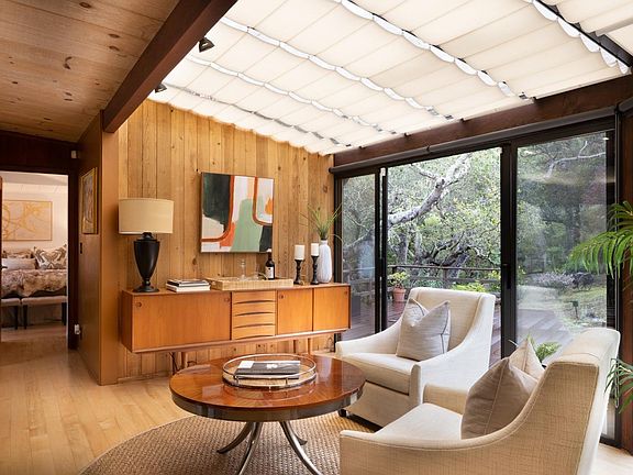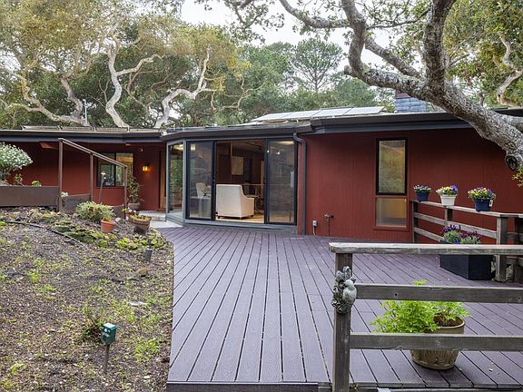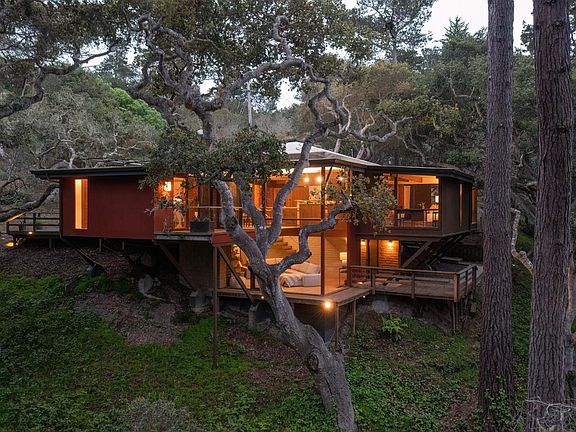 This published Mid-Century Modern masterpiece by famed architect Marcel Sedletzky is nestled on a 1.3 acre secluded hillside among the oaks. Enter into this open modern glass home and be enveloped in natural light from the TEMPERED floor-to-ceiling windows providing views into the wooded canyon showcasing rain storms and the abundance of wildlife/birds. The main floor offers a remodeled upper-level living area with exposed redwood ceiling complementing the hand-sawn redwood walls built by Sedletzky himself. Walk down the cantilevered floating stairs into the large, private, post-adobe style living room to sit around the custom fireplace featuring a modern flame presentation. This is the very room where Joan Baez and Bob Dylan entertained their friends with private concerts and made special memories. Be mesmerized by the peaceful beauty this quintessential Carmel home offers in this spectacular architecturally designed home with a treehouse atmosphere. MOVE-IN READY!