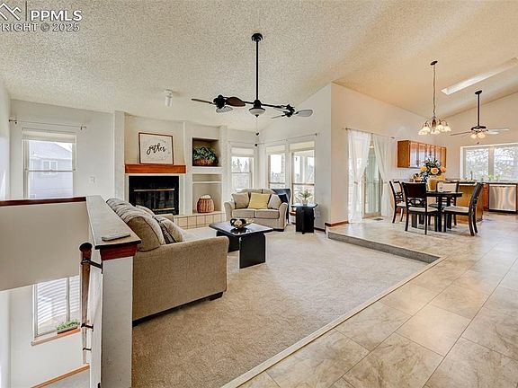 This flexible ranch plan, nestled in a quiet cul-de-sac, offers more than 2700 square feet of living space with mountain views. Tons of natural light floods in from all angles via skylights, generous windows, walk-out basement and bonus SUNROOM. This home in desirable School District 20 has some new paint, all new carpet throughout, a new roof in 2023 and a new deck that same year. Enter to a sunken living room focused around a wood-burning fireplace, and an open concept floorplan that flows naturally between living, dining and kitchen spaces. Kitchen offers a breakfast bar and granite countertops. Check out how much snow is on Pikes Peak while doing the dishes! The charming sunroom is off the dining area en route to the generous and well maintained deck. On this floor, down a dedicated and private hallway, there are three bedrooms including the master suite. One could be used as a convenient office if desired. All have generous closet space. The master has an attached bath with spa shower, and the two other bedrooms are served by a secondary bathroom. But wait, there is SO much more! Downstairs is a family room with several bonus areas that you can transform to suit your needs, whether its a second office space, a fitness studio or a homework area - the possibilities are endless! There are also two LARGE bedrooms and another bathroom with tub/shower combo. The quarter-acre yard has tons of possibilities and a large storage shed. Backyard is fully fenced with gates on both sides and a newer concrete sidewalk from front to back. No crossing Research to get to Explorer Elementary and so convenient to shopping and parks!