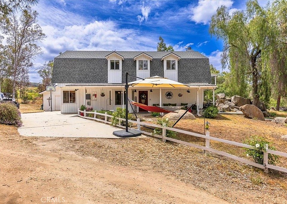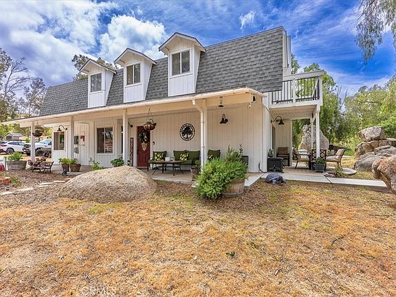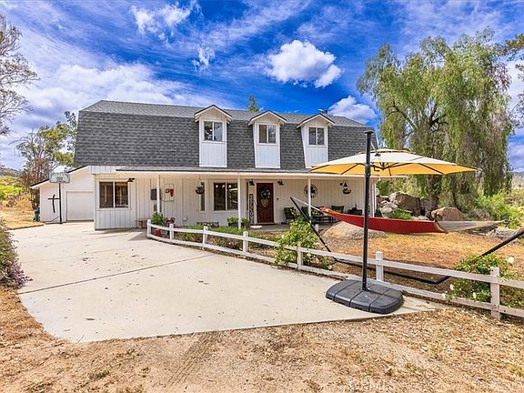 Looking for that home that is set apart from all others? Well look no more, here it is, your own piece of paradise! This cozy home is nestled in the foothills of Sage/Hemet boasting over 9 acres surrounded by usable land, tall trees and gorgeous views. The main home is 1860 sq. ft and offers 4 bedrooms with 1 bedroom and bath on the main level and additional rooms upstairs. Upon entry you are met with a bright & cherry open floor plan, cozy fireplace, spacious kitchen with granite counters, newer appliances and plenty of storage. Off the kitchen is your utility room offering washer/dryer hookups, walk-in pantry and full bathroom. Off the living area is a outdoor eating area with covered patio, concrete stairway to a wood gazebo and an additional area with stamped concrete and raised deck. Upstairs are additional bedrooms, 1 full bath and views from every window. The primary bedroom has built in cabinetry, mirrored wardrobe doors and ceiling fan. Opposite end is an additional oversized bedroom, mirrored wardrobe doors, ceiling fan and private balcony. Still need more room? This property has a "permitted" cottage of an additional 320 sq. ft. for the perfect ADU. It offers AC & decomp Toilet and ready for you to add your final touches. The grounds are amazing lots of natural trees, fruit trees, almond tree, berries, etc., 2 additional storage sheds, large chicken coop, playset, garden beds, oversized detached garage and oh lets not forget brand new solar just installed Oct. 2022. Garage has brand new 25 year Roof and 1/2 of main home has New Roof as well. RV electric & water hookups available. You are buying a lifestyle, not just a home!