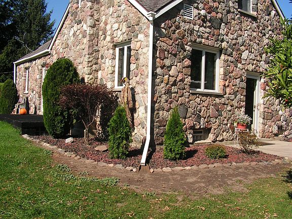 Charming split field stone home on 3.75 rolling acres w/abundant wildlife. Features incl manicured landscape w/many beautiful species of trees backing up to Milwaukee Creek, pond, 22x34 - 3 car garage, storage shed w/electricity, 16x20 deck, Anderson windows, city water, natural gas, oak merillar kitchen, hardwood floors, stone fireplace w/blower, whirlpool tub, cove ceilings, basement w/workshop, efficient utility bills, 6x30 dog kennel.