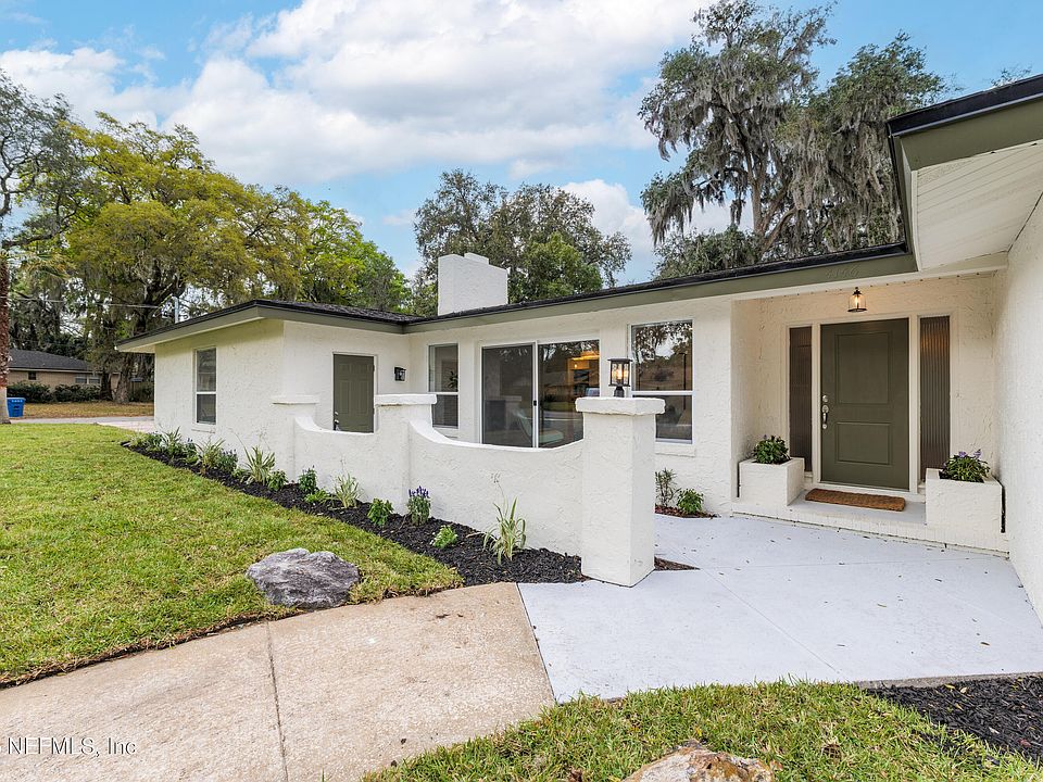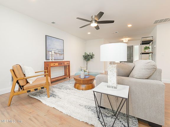 This stunning home was just thoughtfully renovated providing beautiful, carefree living with views of the river from the front yard! Home sits on an oversized, corner lot and features great architectural detail, welcoming guests with a courtyard entry at the front door. Inside is a spacious layout with an abundance of natural light from three large, new sliding doors throughout the central living space. The central living area features two spacious living/family rooms, one featuring a wood burning fireplace, with an attached dining space that's open to a brand new, oversized kitchen featuring white shaker cabinets, new appliances, quartz countertops and a marble backsplash. The home features an in-law/office suite off of the kitchen with private entry through the back of the house. On the other side of the home you'll find two large bedrooms sharing a stunning, full bathroom with double vanity in the main hallway. The primary suite is a fantastic size and features a stunning bath with walk-in shower, double vanity and walk-in closet. Carefree living as the roof was replaced in 2019, brand new HVAC, and was just repiped. Inside features new water resistant laminate flooring, all new light fixtures, fully renovated and designed inspired bathrooms, freshly painted, and more. Property sits on a great sized corner lot featuring new sod in the front yard and a fully fenced backyard. A freshly re-screened screened-in patio provides year round enjoyment as well.