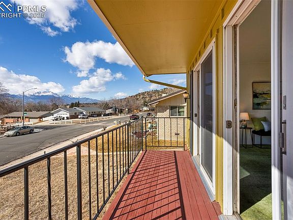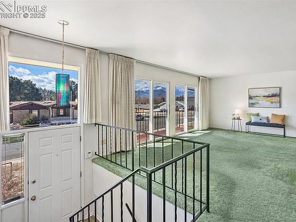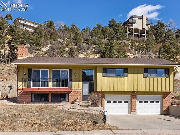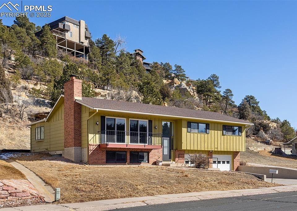 BEAUTIFUL VIEWS OF PALMER PARK AND PIKES PEAK ON 1/4 ACRE LOT THAT BACKS TO BLUFFS! COME ENJOY YOUR MORNING COFFEE ON THE FRONT DECK AS YOU TAKE IN THE BEAUTIFUL VIEWS! IF A GORGEOUS LOCATION IS A PRIORITY--THIS HOME IS FOR YOU! Enjoy the view of the unique sandstone rock formations in back. This Garden Ranch bi-level features all the best views the city has to offer in a beautiful serene neighborhood! Upon entry, you will notice the oversized entry window creating a bright and open space. The wrought iron stair railing depicts the mid-century design of the home. The living room is framed by 2 sets of sliding glass doors streaming natural light and beautiful mountain views. The dining room and kitchen are open to the large 23 x 18 family room with lots of windows bringing in the beauty of the bluffs. The family room features a vaulted ceiling and a large sliding glass door to a private patio with retractable awning. Kitchen features an island/bar. Laundry is located at the end of the kitchen. The Primary bedroom features a walk-in closet and 3/4 bath. You could literally live on the main level of this home! The basement is garden-level and has a family room/office that features a brick fireplace with shelving and a wall of windows with Palmer Park and Pikes Peak in center view! There is an additional 4th bedroom and 3/4 bath in the basement. The garage is oversized and finished with stucco textured walls and a workshop area. There is an extra driveway to the East side of the lot for extra parking. The interior windows are newer high quality Anderson windows, except in lower bedroom and mechanical room. The Primary bedroom bath features a solid-stone shower basin and walls. Downstairs bath is updated with newer cabinet, marble sink/counter, solid-stone shower walls and basin. Enjoy the incredible potential this home has to offer with its large lot, beautiful views, and premium location! Come see it today!