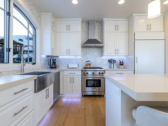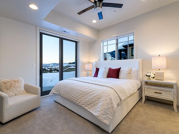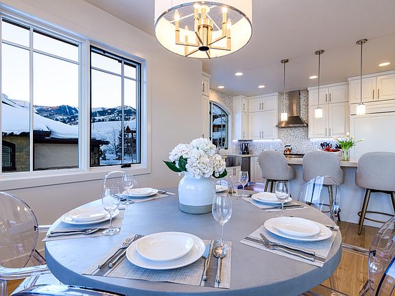 Three bedrooms are thoughtfully arranged on the first floor, making this home an ideal getaway for family gatherings and small groups alike. The Master Bedroom features a king-size bed with a large flatscreen TV mounted above a cozy fireplace. The private ensuite bathroom for the Master offers high-end finishes, such as a rainshower head in the Euro-glass walk-in shower. The Guest Bedroom also features a king-size bed, flatscreen TV, and fireplace as well as direct access to the hot tub patio. The Bunk Bedroom has a Captain's bunk with a full bed on the bottom, plus a twin-size bed on the top. A shared full bathroom on the first floor features a large Quartz-top dual vanity and tub/shower combo. The spacious, open floorplan on the second level ensures that everyone in your group can gather and relax while sharing quality time together. The living area features a large flatscreen TV and gas fireplace, surrounded by a contemporary sectional sofa offering plenty of seating. The adjacent dining area has a table for 6, with 3 additional seats available at the kitchen island nearby. Custom shaker cabinets, stainless steel appliances, and Wolf gas range adorn the kitchen, making cooking meals together a treat. From the living area, step outside onto the deck to take in the stunning views of the Wasatch Mountains or watch as the passing golfers tee off at the fairway. A private hot tub awaits on the lower level patio to soothe tired muscles after a day out of exploring all this area has to offer. This InvitedHome rental includes a dedicated vacation consultant team, trip planning assistance from booking to checkout, high-end linens, and a responsive local team to ensure your stay goes exactly as planned. This home could be rented for the month or by the week and it sits on a gorgeous golf course or you can spend your day hiking and mountain biking.