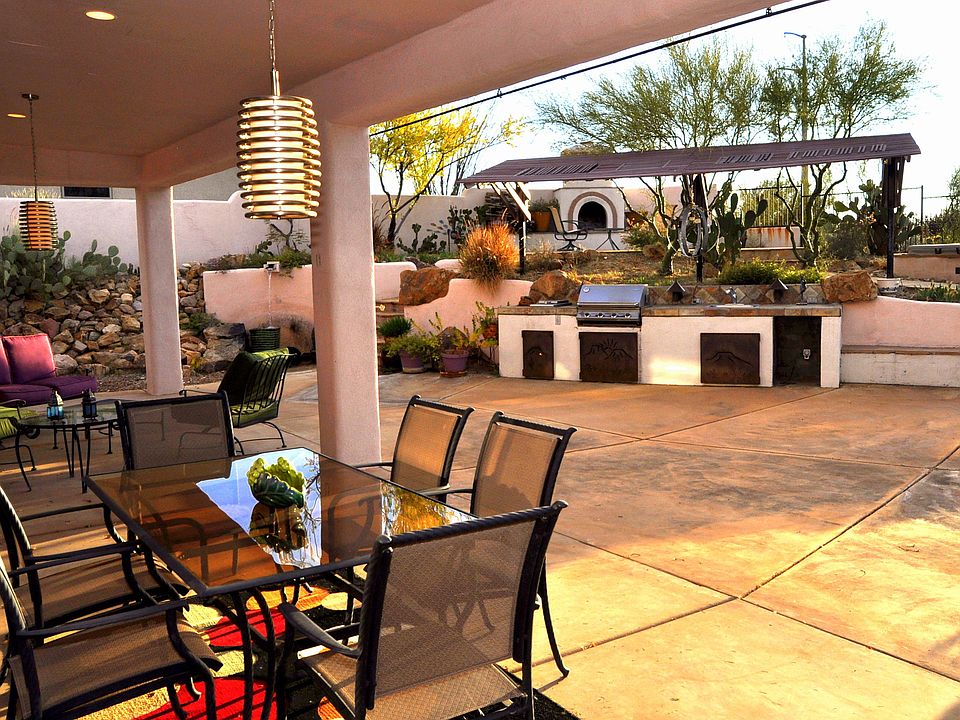 Entertain the crowd in this modern hm w/clean contemporary lines. A total lifestyle. Fabulous hm & outdoor living. Expansive patios, outdoor kitchen & kiva FP give lots of places to entertain. Open floor plan. Lots of upgrades, 10 ft ceilings, gas FP, tile, concrete floors. Situated on a ridge w/open vistas of sunsets & MTN's. 1/2 acre +. 3 BR's & den - can easily be converted to 4th BR. Split plan & 3 baths. Greatroom plan, designed w/the LR & dining area open to the kitchen featuring SS appliances, custom back splash & breakfast bar island. Expansive master suite features a LG walk in closet, jetted tub, granite counters & separate shower. Energy efficient w/low Solar electric bills. Rain harvesting, flagstone patios, fountains. Oversized garage w/extensions for width, depth & height + 220
