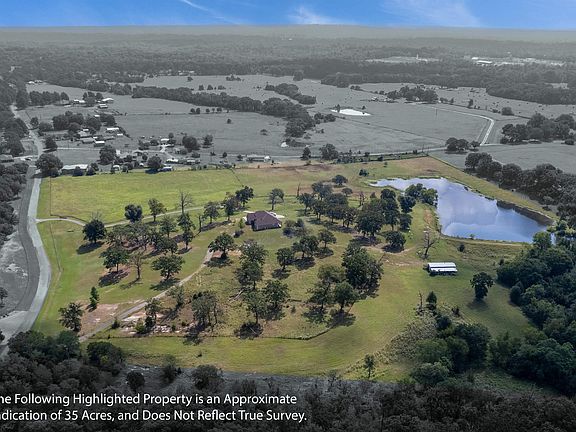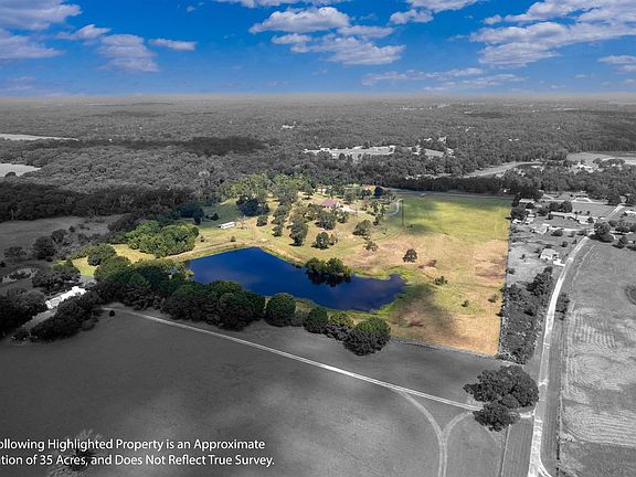 Stunning home on 35+ acres with large, stocked pond. This custom Middleton built home sits beautifully atop a hill offering breathtaking views of the surrounding landscape. Enter the property grounds through a solar powered gate as the asphalt driveway leads to ample concrete padded parking and an oversized 2 car garage large enough for plenty of extra equipment and storage. The entire property is fenced and also has cross fencing making it ideal for livestock and outdoor activities. The large pond is stocked with wide mouth bass, perch, and channel catfish. Inside the home you will find spacious living with an open concept and thoughtfully designed floorplan. The living area boasts French doors which lead to the back patio with a view of the lake. The stone gas fireplace, crown molding throughout, soaring ceilings, beautiful wrought iron staircase & balcony serve as unique focal points of this home. The gourmet kitchen flaunts custom built cabinetry, a walk-in pantry, granite countertops, oversized breakfast bar, stainless appliances, gas cooktop and separate oven, and undermount lighting adding stunning ambiance. The large primary bedroom is on the main level and offers an ensuite bathroom with jacuzzi tub, spacious separate shower, private water closet, dual sinks, generously sized walk-in closet with built in's and so much more. There is also another bedroom and full bath on the main level that is ideal for a nursery or guests. Two secondary bedrooms, a flex room that could serve as a 5th bedroom or game room, and a 3rd bathroom are located upstairs. There is also lots of easily accessible attic storage space upstairs. The nicely sized office space located on the first floor has pocket doors could even serve as an additional bedroom if needed. More custom details that add charm to this home are the wood and stone accents along with lots of windows adding optional natural light, but the 360-degre view that this property offers will leave you speechless!