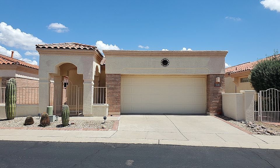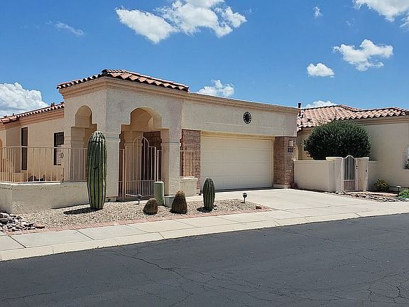 Brick and stucco displays a contemporary design as you enter through an attractive four pillared canopy walkway. You'll love the angled architecture that guides your way into a broad great room where high vaulted ceilings deliver an open airy feeling. You will immediately notice the glass sliding doors combined with corner windows to paint picturesque views of the Santa Rita mountains. The expansive kitchen is wrapped in rich mid-tone cabinetry and its unique shape in conducive to multiple helpers when needed. The adjacent eat-in nook is a convenient place for light meals. Two Master suites both with walk in closets and showers . One master bedroom suite includes a large office area with built in cabinetry. The split arrangement for the guest ensuite is the perfect arrangement for visitors. Relax and enjoy beautiful views from your extended brick patio with swaying palm trees and a backdrop of majestic mountain vistas! HOA $475 year GVR $450 year 2013 Taxes $2123 Lot Size 40 x 122 CALL Ken @ 520-440-7168 for a viewing appointment