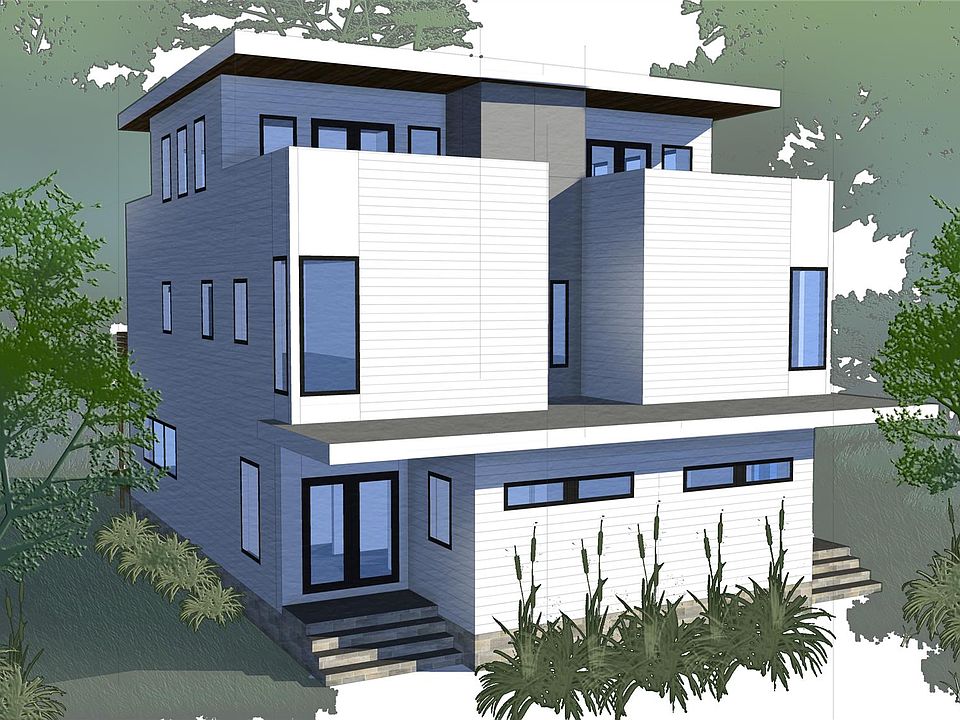 Sylvan Summit Home with volume ceilings, natural light, open plan ; deck, mudroom and office on main ; three bedrooms on second ; master suite with private deck ; large entertaining space on third floor with two decks on either side